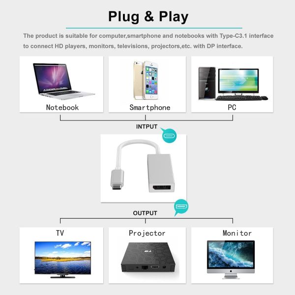 Το προϊόν είναι κατάλληλο για υπολογιστές, smartphone και φορητούς υπολογιστές με διασύνδεση Type-C 3.1 για σύνδεση συσκευών αναπαραγωγής HD, οθονών, τηλεοράσεων, προβολέων κ.λπ. με διεπαφή DP.