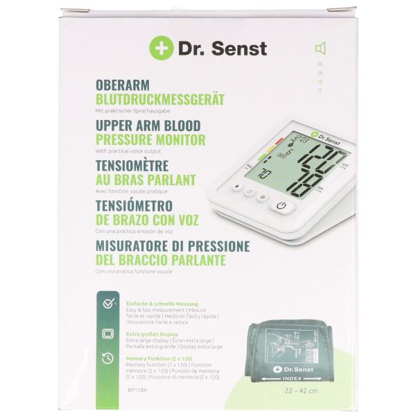 Με μέγεθος 150 x 110 x 60 mm και βάρος 525 g, το Dr. Senst® BP118A εύχρηστο και εύκολο στη μεταφορά. Περιλαμβάνονται 4 μπαταρίες AA, ώστε η συσκευή να είναι έτοιμη για χρήση.