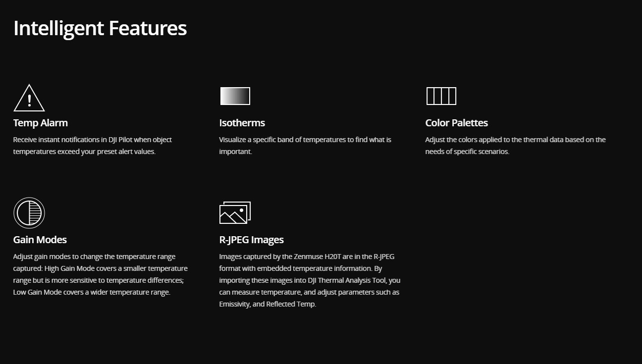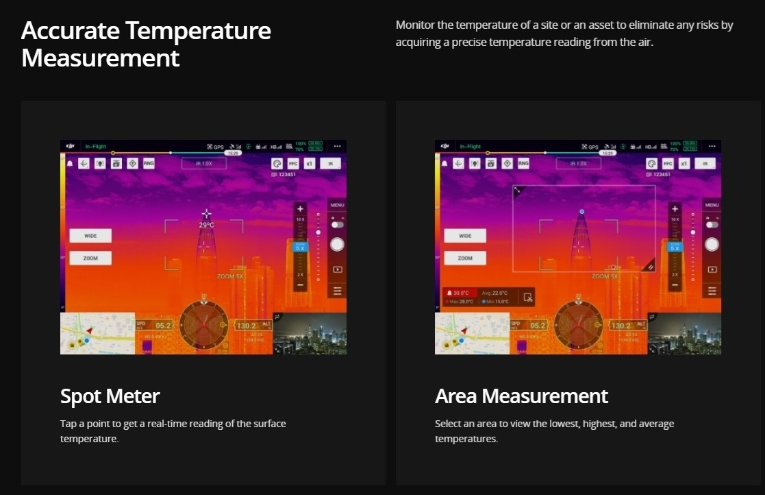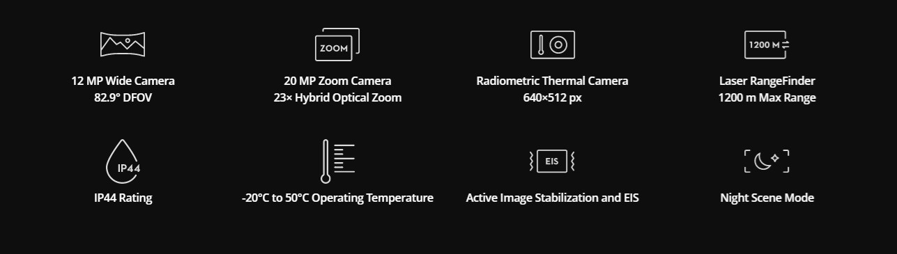 Αποτυπώστε τα πάντα. Από κοντά ή από απόσταση. Σε αληθινό ζωντανό χρώμα ή θερμικό. Ένας ενσωματωμένος μετρητής απόστασης λέιζερ (LRF) μετρά την απόσταση από ένα αντικείμενο σε απόσταση έως και 1200 m. Ένα ισχυρό, ενσωματωμένο ωφέλιμο φορτίο που απελευθερώνει προηγμένες έξυπνες δυνατότητες για τις βιομηχανικές πλατφόρμες drone της DJI.