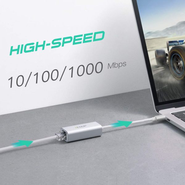 2. Προσαρμογέας LAN σε USB-C – Ενεργοποιήστε σταθερές ταχύτητες σύνδεσης έως και 1 Gbps. συμβατό προς τα πίσω με δίκτυα 100Mbps/10Mbps. Ο προσαρμογέας δικτύου μας τύπου C σε LAN Gigabit Ethernet (RJ45) υποστηρίζει μεγάλες λήψεις σε μέγιστες ταχύτητες χωρίς διακοπή. (Βεβαιωθείτε ότι χρησιμοποιείτε καλώδια Ethernet CAT6 και άνω για να φτάσετε στο 1Gbps)