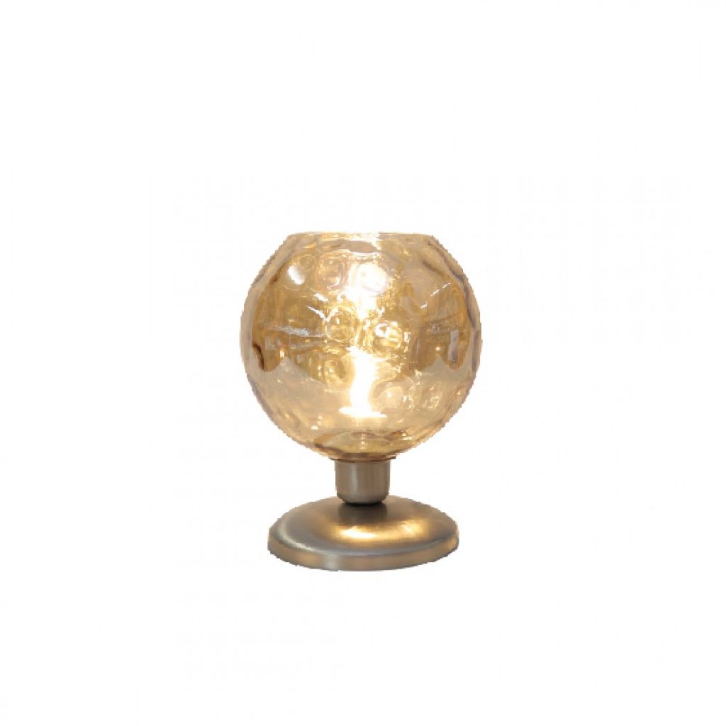 Πρόκειται για ένα επιτραπέζιο μεταλλικό φωτιστικό. Η λιτή του σχεδίαση συμπληρώνεται με το γυαλί.