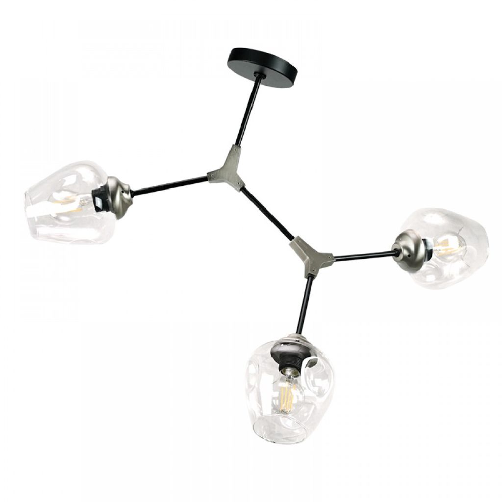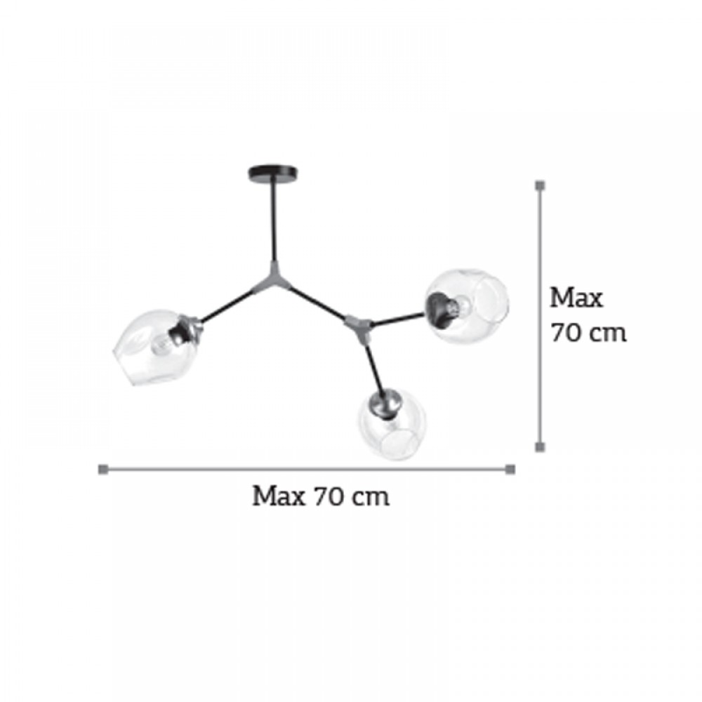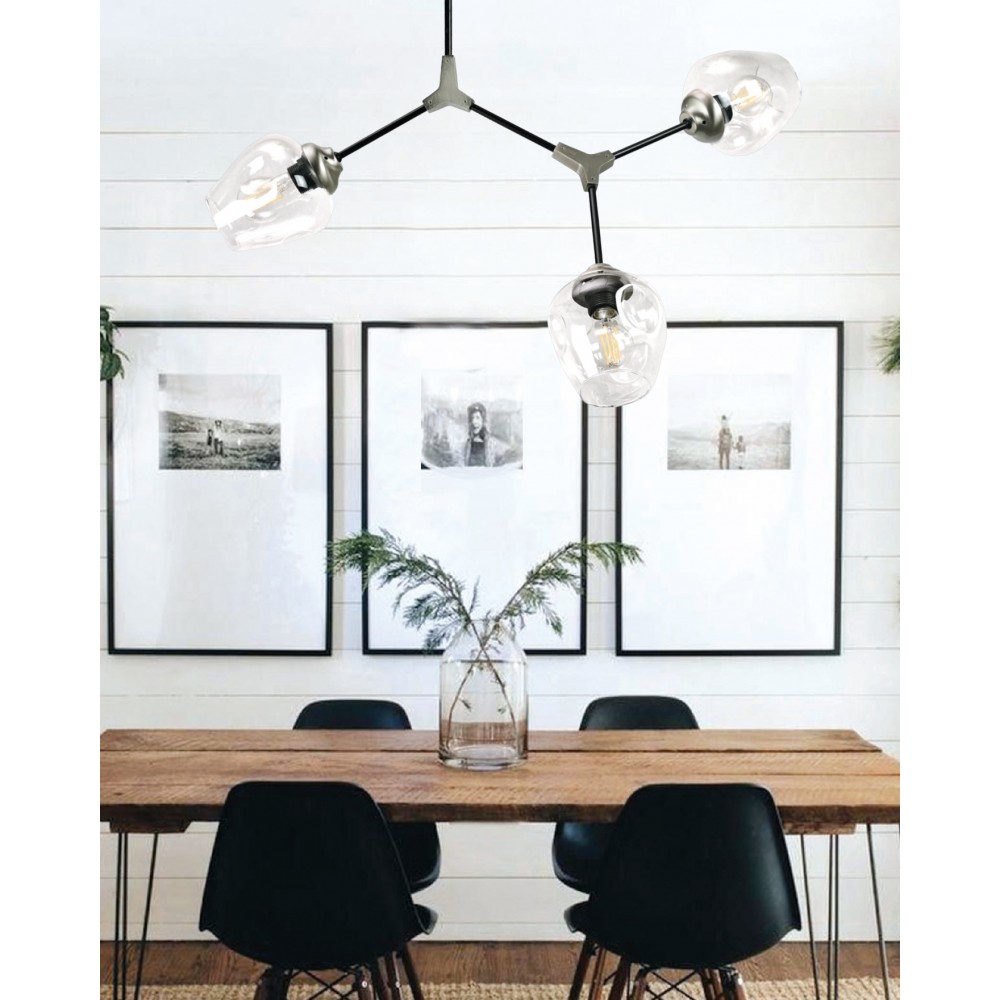 Πρόκειται για ένα μεταλλικό κρεμαστό φωτιστικό μαύρου χρώματος με νίκελ διακριτικά στοιχεία και τρεις λαμπτήρες. Το γυαλί είναι διάφανο, αλλά υπάρχει και η επιλογή του φιμέ χρώματος. Ο βραχίονας με τους δύο λαμπτήρες κινείται για να λάβει το επιθυμητό σχήμα. Η μίνιμαλ σχεδίασή του το τοποθετεί σε οποιονδήποτε μοντέρνο εσωτερικό χώρο.