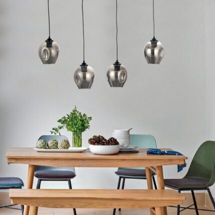 Πρόκειται για ένα μαύρο μεταλλικό φωτιστικό με λευκή οπαλίνα και τέσσερις λαμπτήρες.  Το ύψος μπορεί να ρυθμιστεί ώστε να προσαρμοστεί στον μοντέρνο χώρο τοποθέτησής του.