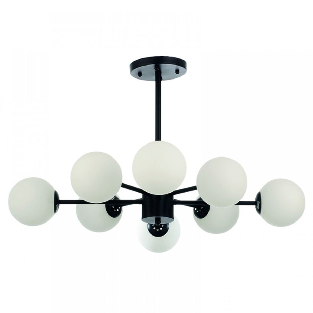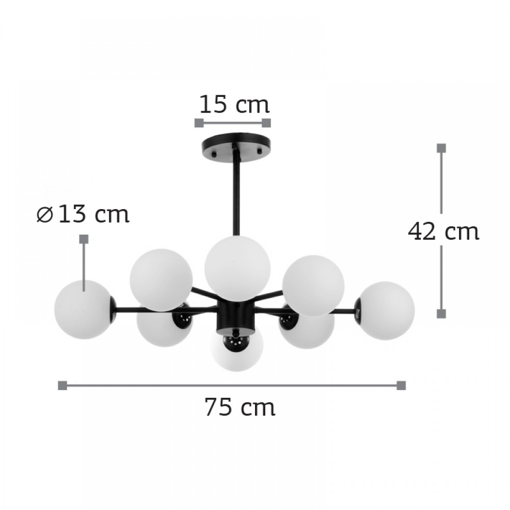 Πρόκειται για ένα μαύρο μεταλλικό φωτιστικό με λευκή οπαλίνα στο τελείωμα και οχτώ λαμπτήρες. Η μίνιμαλ σχεδίασή του το τοποθετεί ιδανικά σε οποιονδήποτε μοντέρνο εσωτερικό χώρο, ακόμα και αν είναι χαμηλοτάβανος.