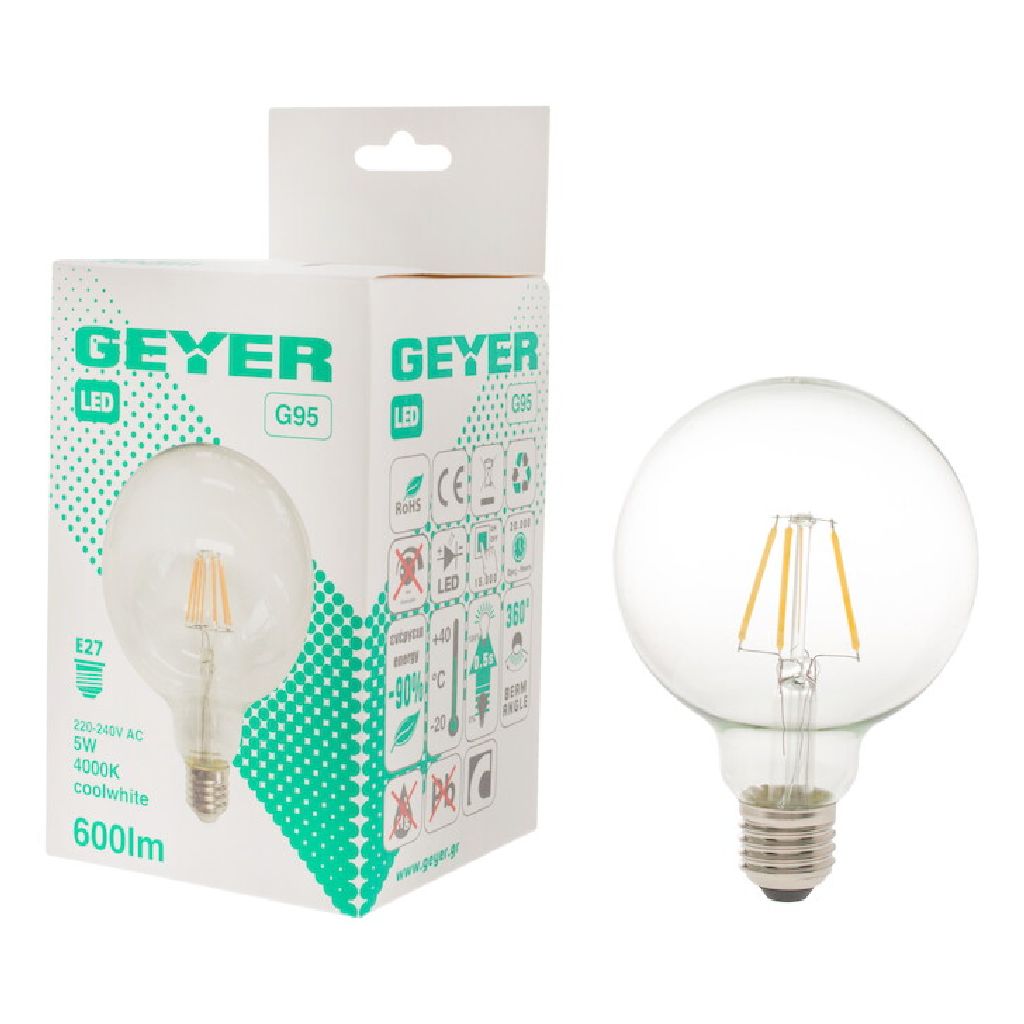 Γλόμπος LED filament G95 5W, E27, 4000K, 600Lm για έντονο ψυχρό φωτισμό.
