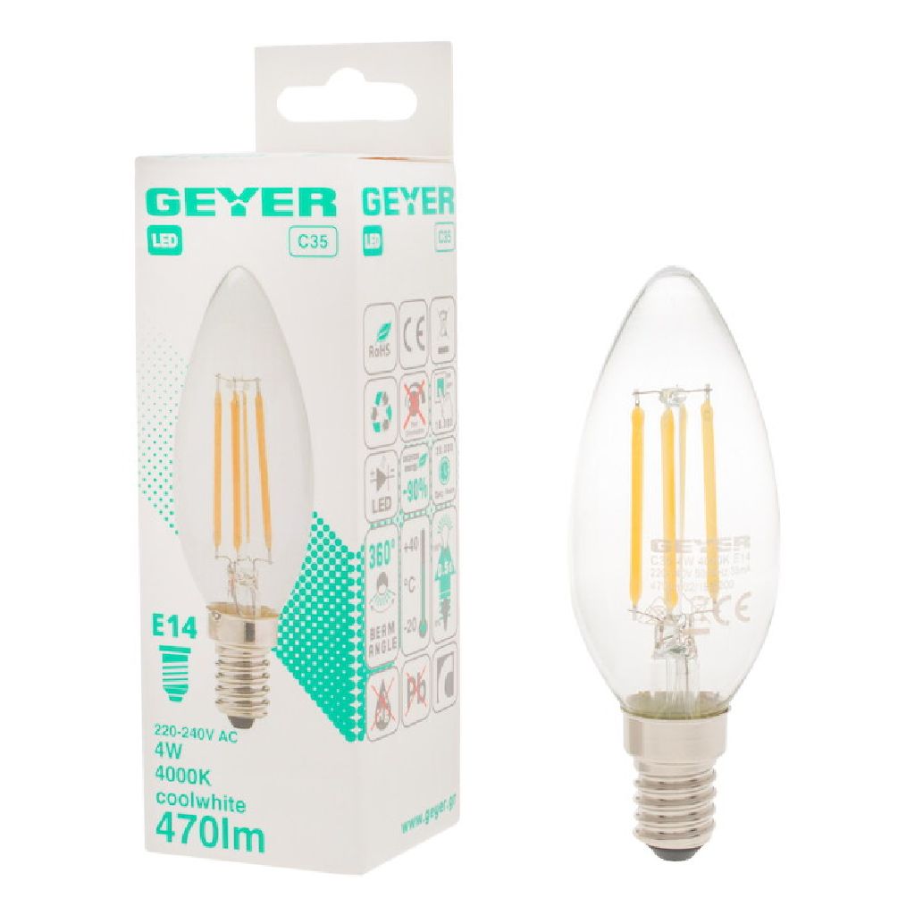 Κερί LED filament C35 4W, E14, 4000K, 470Lm για ψυχρό διακοσμητικό φωτισμό.