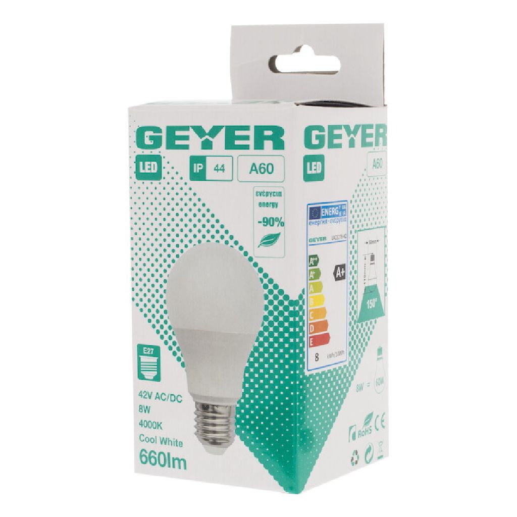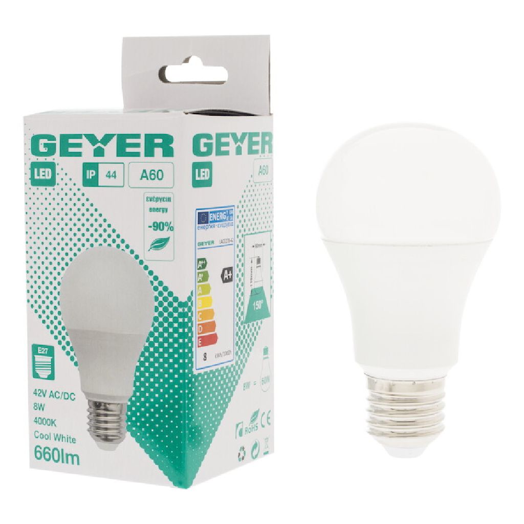 Κλασική LED A60 8W, E27, 4000K, 810Lm, 42V, IP44 για ψυχρό φωτισμό μικρού ρεύματος.