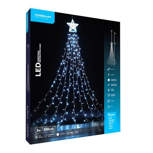 Δημιουργήστε γιορτινή ατμόσφαιρα με 300 λευκά ψυχρά LED και 8 λειτουργίες φωτισμού. Ενεργειακά αποδοτικό, ασφαλές για χρήση σε εσωτερικό και εξωτερικό χώρο (IP44), με ευρωπαϊκό φις και διαφανές καλώδιο για κομψή εμφάνιση.