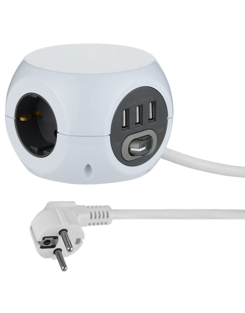 Πολύπριζο σούκο 3 θέσεων με διακόπτη και καλώδιο 1,5m διαταμής 3×1,5mm². Έχει τάση τροφοδοσίας 230V, συχνότητα λειταυργίας 50/60Hz και ένταση ρεύματας 16Α. Διαθέτει προστασία επαφών. Είναι σε λευκό χρώμα και τα υλικά κατασκευής είναι πλαστικό και χαλκός. Ο βαθμός στεγανότητας είναι IP20 και η εγγύηση είναι 2 έτη από την Electraline. Διαθέτει 4 θύρες USB 2,4A.