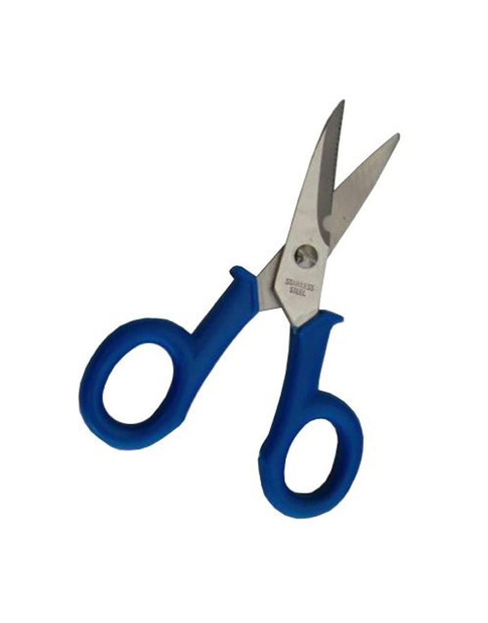 Ψαλίδι ηλεκτρολόγου ίσιο με αυλάκι κοπής καλωδίων σε μπλε χρώμα από πλαστικό και μεταλλικό υλικό.
